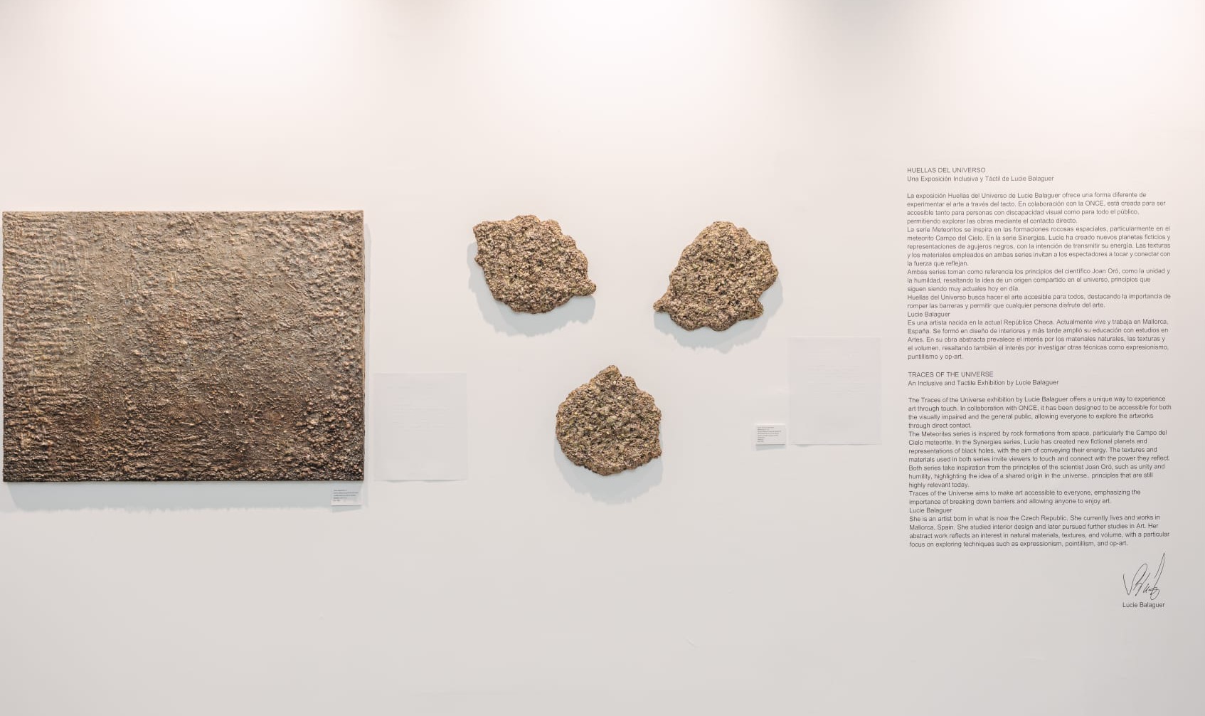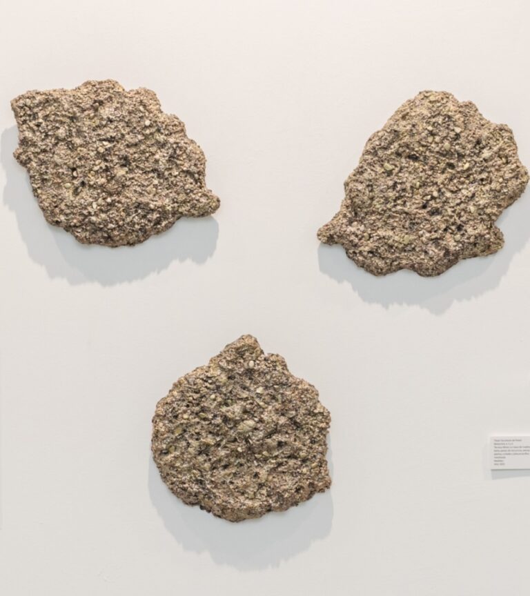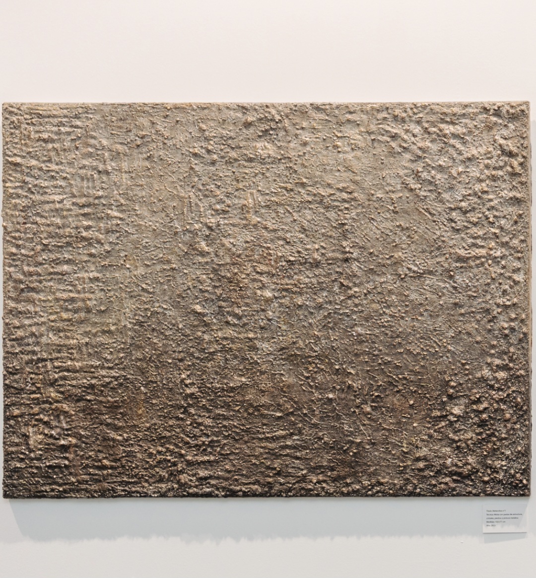 The “Meteorites” series stands out for its shapes, multiple structures, and a palette of metallic colors, drawing aesthetic reference from metallic meteorites, particularly Campo del Cielo. The work stands out for the abundant use of structural pastes, natural elements such as sands, crystals, and stones, aiming to achieve intentional form.