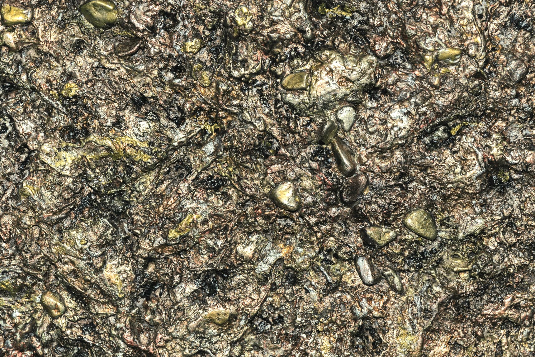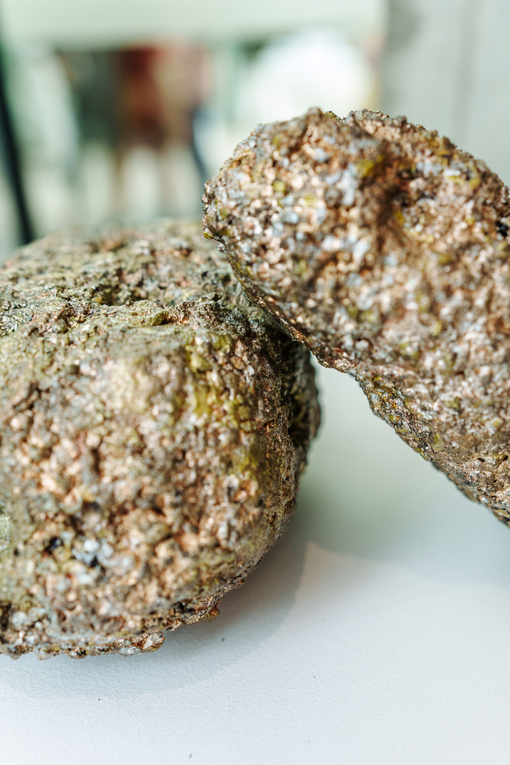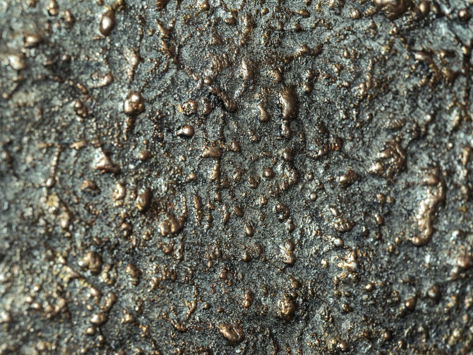 The “Meteorites” series stands out for its shapes, multiple structures, and a palette of metallic colors, drawing aesthetic reference from metallic meteorites, particularly Campo del Cielo. The work stands out for the abundant use of structural pastes, natural elements such as sands, crystals, and stones, aiming to achieve intentional form.